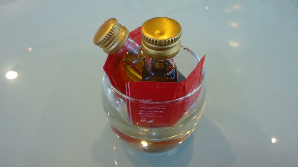 Мне показалось немного странным то, что оливковое масло на столиках было в индивидуальных пластиковых бутылочках, а соль и перец – в бумажной упаковке. Все-таки это неподобающе для “ресторана”, а кроме того – к вопросу о дифференциации – ничем не отличается от основной части лаунжа.