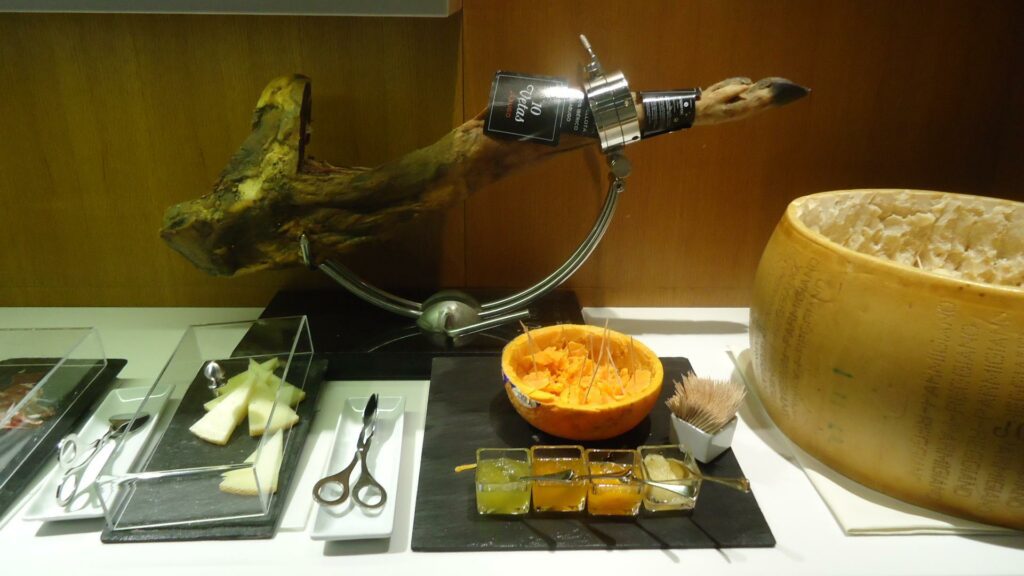 Мой рейс улетал в 13:50, так что около 11:30 я решил перекусить. Как можно было отказаться от салата из лобстера и папайи, а затем телячьих медальонов? Карта вин была ошеломительной, равно и как выбор нарезок, хамон, сыры.