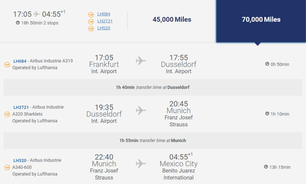 В примере ниже перелет из Франкфурта в Мехико через Дюссельдорф и Мюнхен в бизнес-классе стоит не стандартные 55000 миль, а 70000 миль. Это потому, что цена была пересчитана как внутриевропейский сегмент в бизнес-классе (25000 миль) + сегмент Европа-Южная Америка в бизнес-классе (45000 миль) = 70000 миль.
