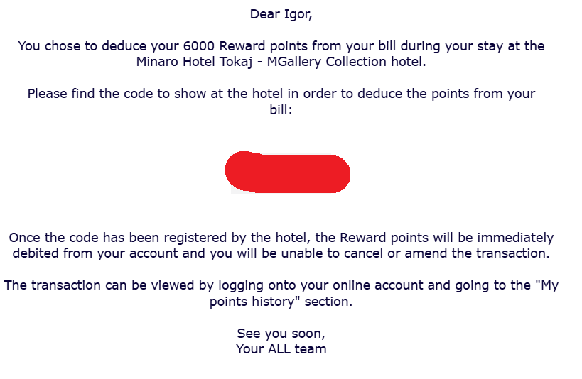 - В любом случае, сотрудник на ресепшне должен выполнить верификацию для списания баллов. Для этого вам на электронную почту или номер телефона, указанные в аккаунте ALL Accor Live Limitless, два раза отправят верификационный код, который вы должны будете сказать сотруднику. После этого баллы списываются со счета, а остаток суммы (если он есть) оплачивается деньгами.