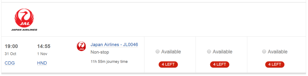 Как видите, на рейс Париж-Токио с вылетом через три дня доступность просто феноменальная: по 4 билета в бизнес- и в первом классе!