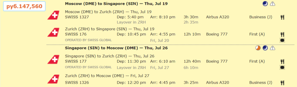 Итак, при бронировании двух билетов можно слетать в первом классе Lufthansa/Swiss из Москвы в Азию меньше чем за 150 000 рублей на человека туда и обратно!