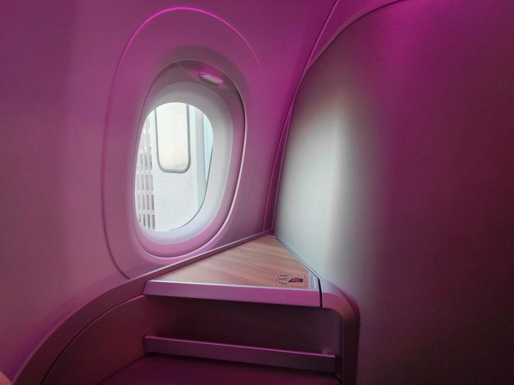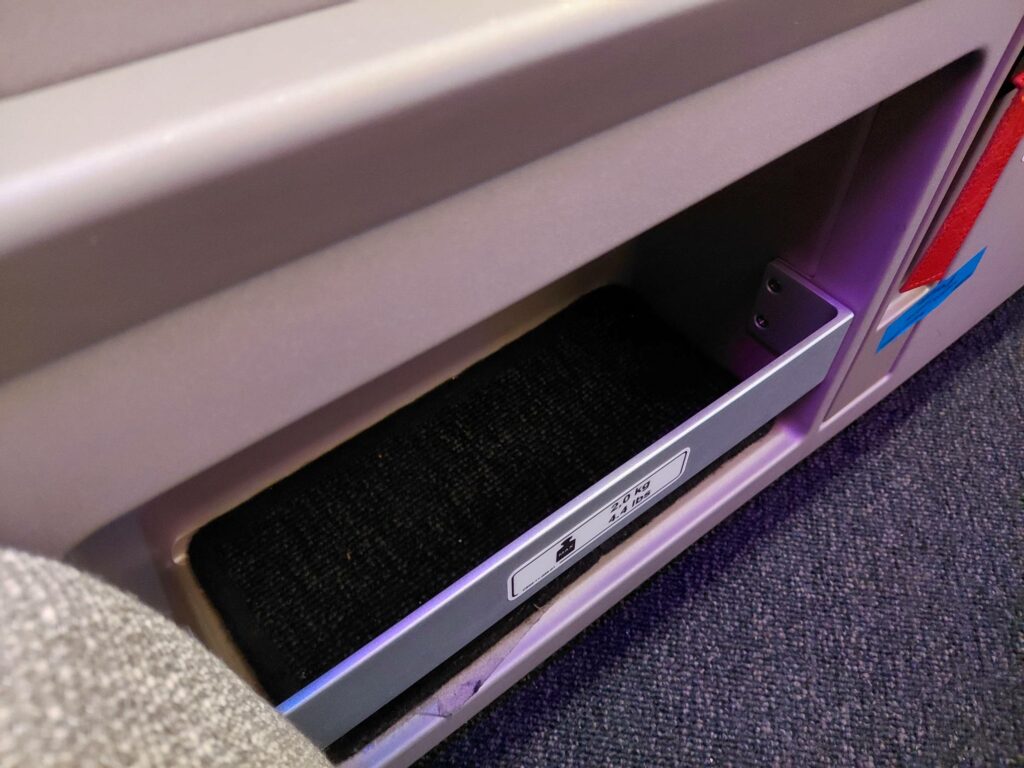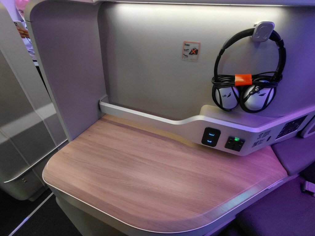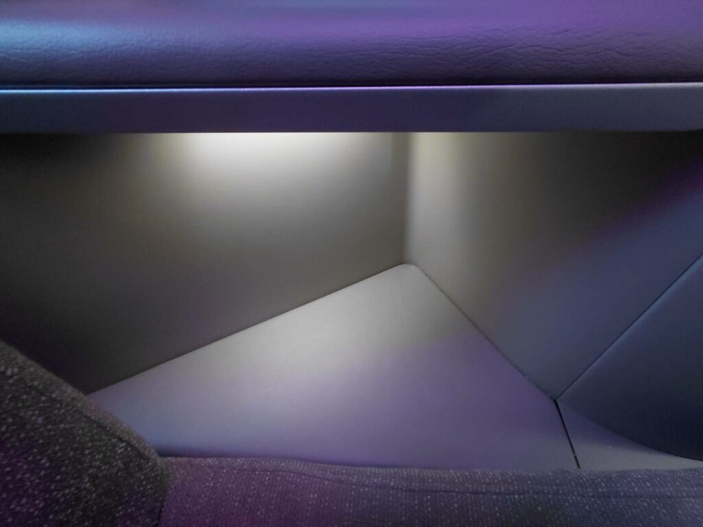 Положить личные вещи здесь некуда; но поверхность расширяется от правого подлокотника, ближе к проходу. Здесь же находится отсек, в который можно запихнуть планшет/ноутбук, плюс электрическая розетка и порты USB.
