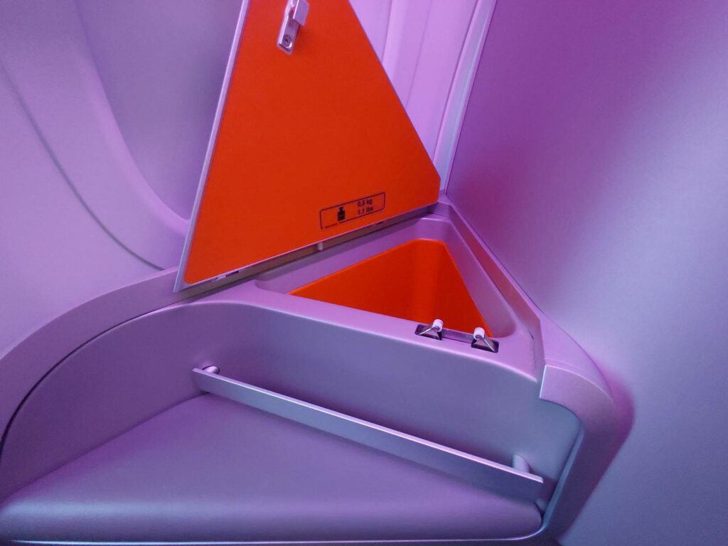 Это был мой первый опыт с креслами herringbone на узкофюзеляжнике. Такая модель не прижилась на широкофюзеляжниках (если чего-то не упускаю, на данный момент её продолжают эксплуатировать только Virgin Atlantic и Air Serbia): она не слишком эффективно использует пространство на борту. Любопытно, почему на узкофюзеляжниках до сих пор herringbone является более популярным выбором авиакомпаний, чем reverse herringbone.