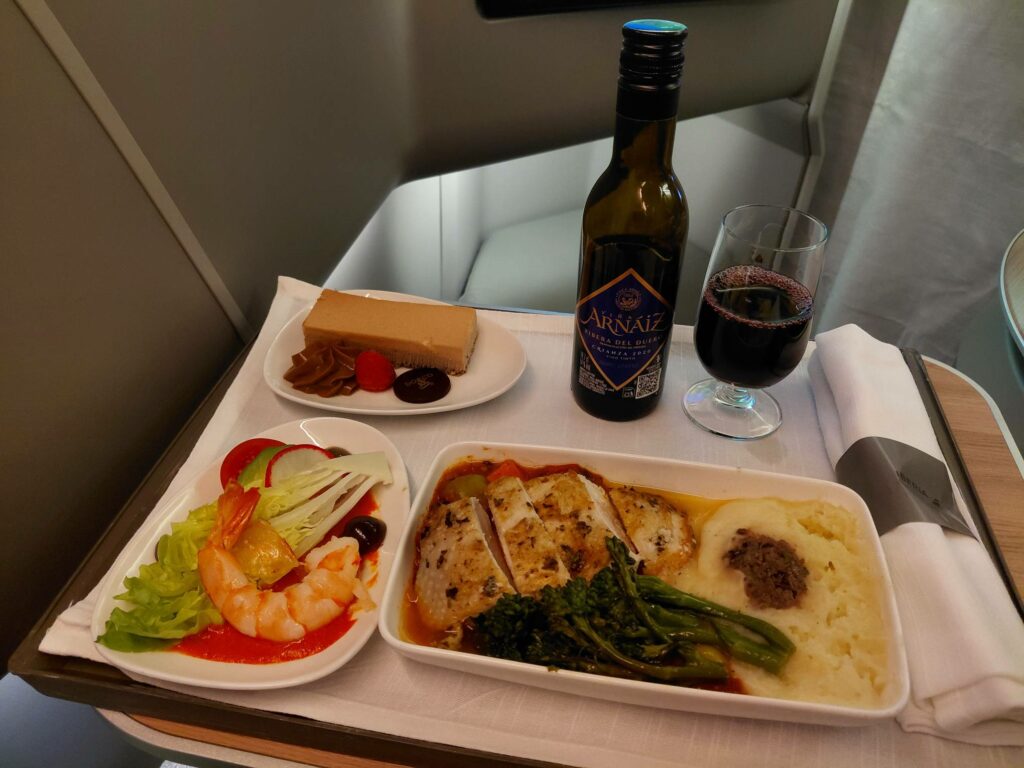 На вечернем рейсе из Дюссельдорфа в Мадрид, ужин включал стартер из могучей креветки с авокадо и острым соусом, куриную грудку в соусе из нута с пюре и мини-брокколи (вторым вариантом была паста), и банановый тортик с dulce de leche. Потрясающе вкусно!