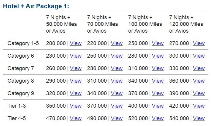 Стандартно, Marriott предлагает лишь пакеты из 7 ночей. Вот стоимость таких пакетов для миль следующих авиакомпаний (количество миль приведено по горизонтали, а категория отеля – по вертикали):