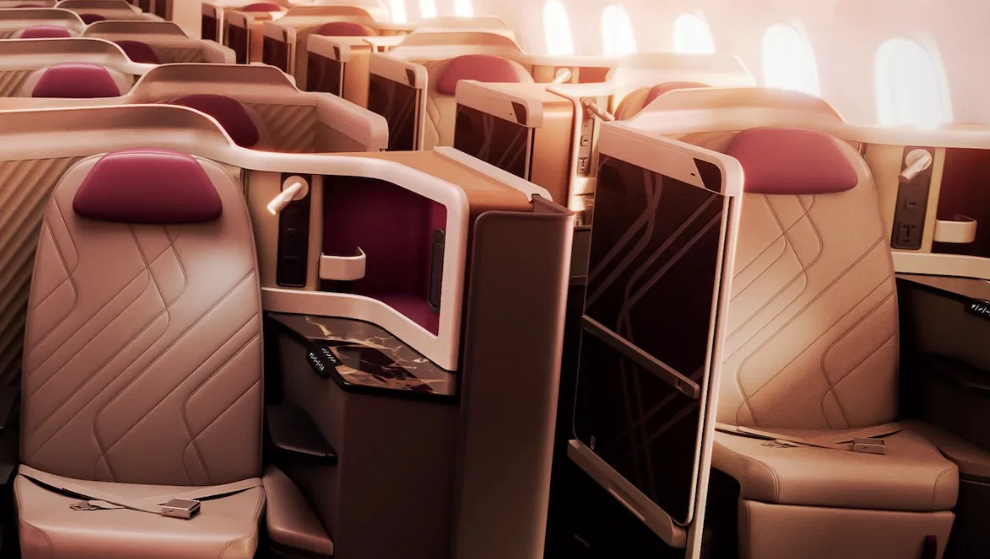 На новых Boeing 787 установлены сьюты Adient Aerospace Ascent. Это такой же продукт, что и в бизнес-классе Qatar Airways. На первом ряду установлены премиальные места с увеличенным пространством для ног и с премиум-аксессуарами.