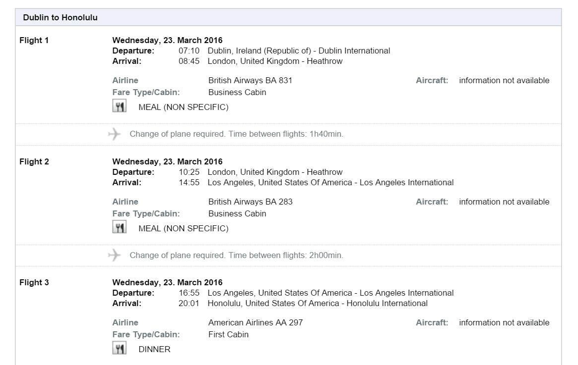 Поиграйтесь направлениями – доступны практически любые города в США. При этом обращайте внимание на города, в которых выполняются стыковки: многие маршруты, если вы выберете самую дешевую цену, включают в себя сегмент Дублин-Филадельфия, выполняющийся на Boeing 757 c сиденьями типа recliner. За незначительную наценку вы можете выбрать позиционирующий перелет в Лондон, а оттуда уже лететь в США на дальнемагистральных самолетах АА или ВА. Я настоятельно рекомендую составить маршрут таким образом, чтобы выбрать Boeing 777-300ER American Airlines. Эти самолеты оснащены сиденьями типа reverse heringbone – самый инновационный продукт на рынке, обеспечивающий максимальный комфорт и личное пространство.