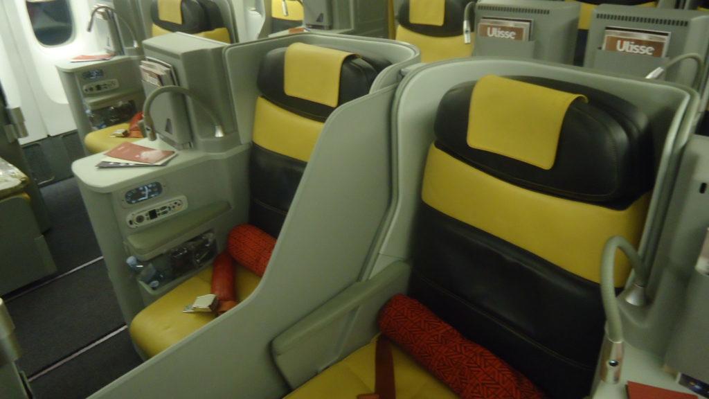 Бизнес-класс Alitalia представлен сиденьями Solstys в конфигурации 1-2-1. Это одна из разновидностей “смещенных” кресел – боковые сиденья попеременно расположены то чуть ближе к окну, то к проходу, а в центральном блоке – попеременно то два сиденья рядом в центре, то у прохода. Подобные сиденья можно также встретить у Iberia и Air Berlin.