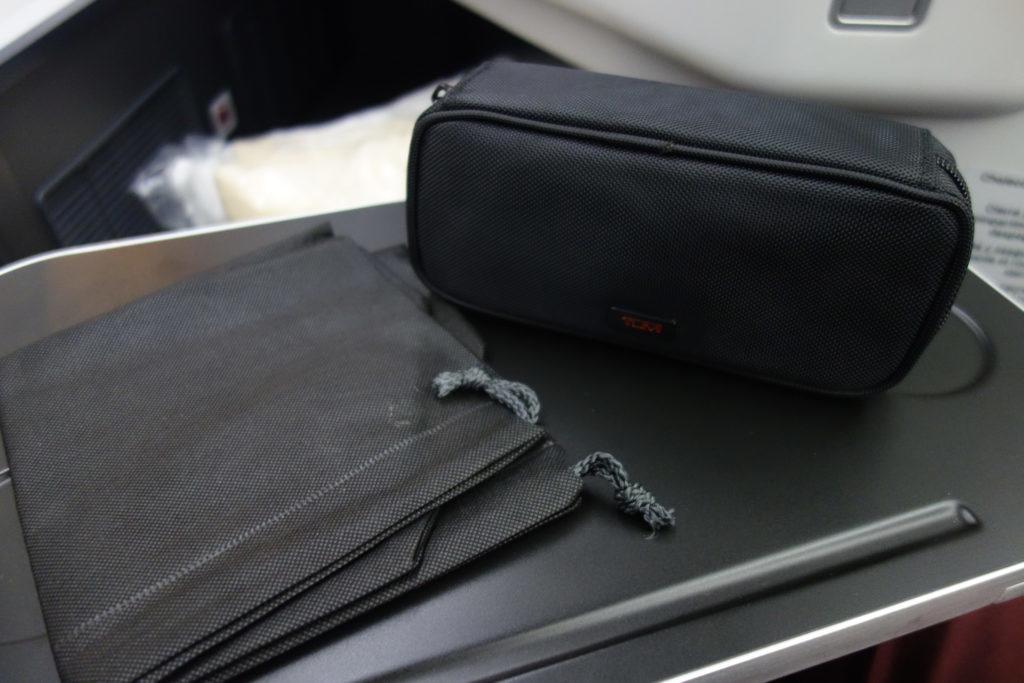 В него входили зубная щетка и паста, крем от L’Occitane, бальзам для губ, ручка, затычки для ушей, маска и салфетки. Сама сумочка была от Tumi (не было бы написано Tumi, подумал бы, что Fuflo). Не тот набор, который хочется брать домой, но вполне адекватный для нужд перелета.