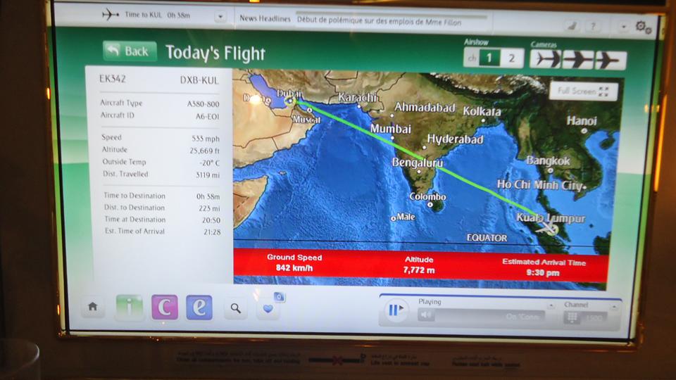 В 10:22 по громкой связи обратился капитан, извинившийся за небольшую задержку и сообщивший, что время полета составит 6 часов 30 минут. Из-за траффика в аэропорту Дубая у гейта придется подождать еще 15 минут. Полет ожидался бестурбулентный, а температура в Куала-Лумпуре – 30 градусов.