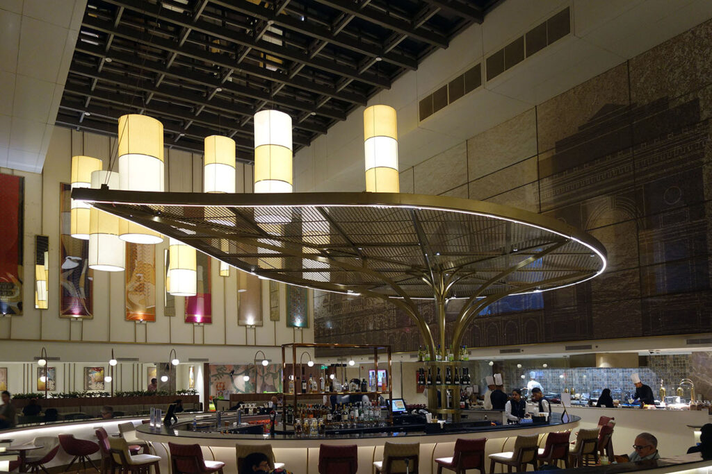 Точка притяжения зала – ресторанно-барная зона с высокими потолками и изящным балдахином в форме… листка? капли?