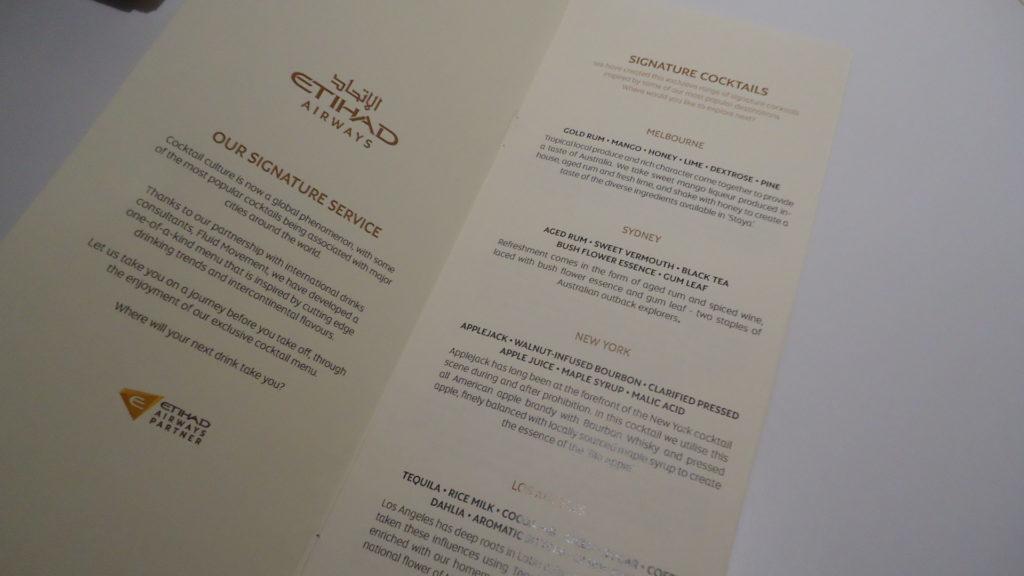 Меню по традиции состояло из обширной коктейльной карты, каждый элемент которой назван в честь города-назначения маршрутной сети Etihad.