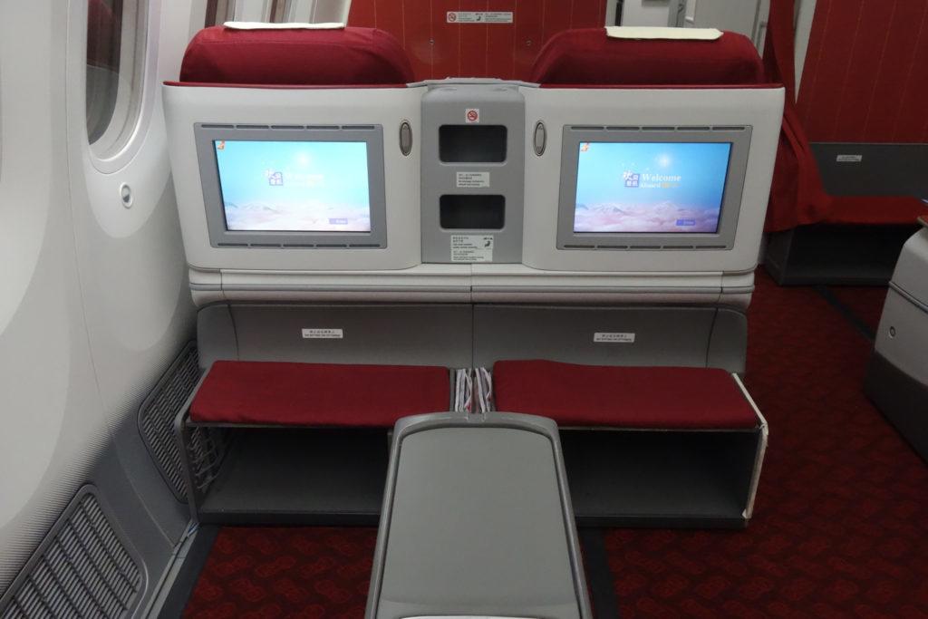 Мне нравится, что под поставкой для ног есть полноценное отделение, в которое помещается даже небольшой carry-on. У некоторых авиакомпаний (например, у Turkish Airlines) это отделение закрыто стенкой с передней части, и открывается поднятием подставки. У Hainan подставка является фиксированной, зато нет передней стенки. Это не так удобно, если вы захотите что-то достать из отделения при полностью разложенной кровати.