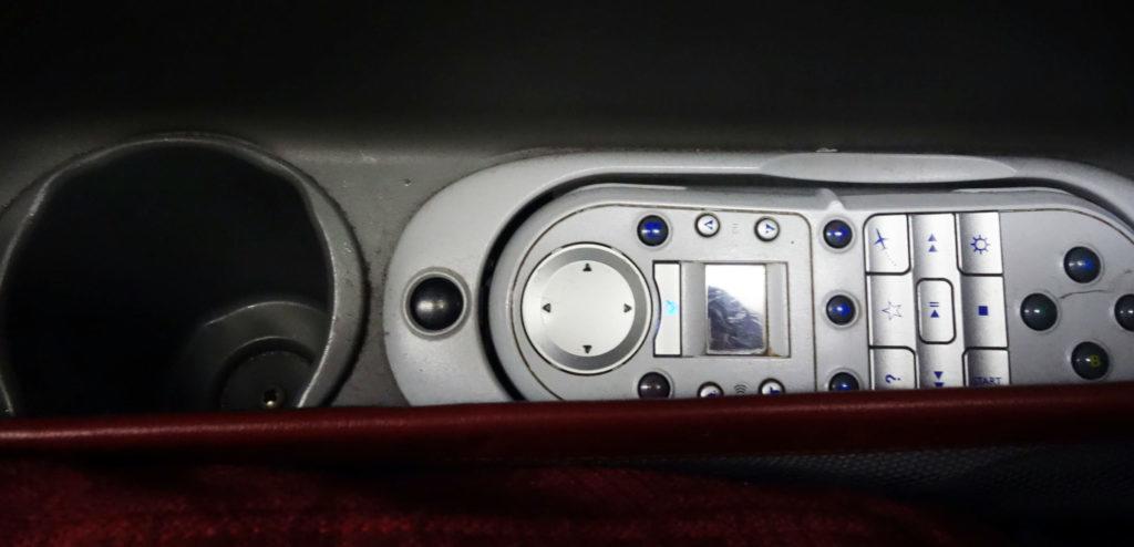 Под подлокотником находится круглое отделение для бутылки с водой, а рядом – пульт управления системой IFE.