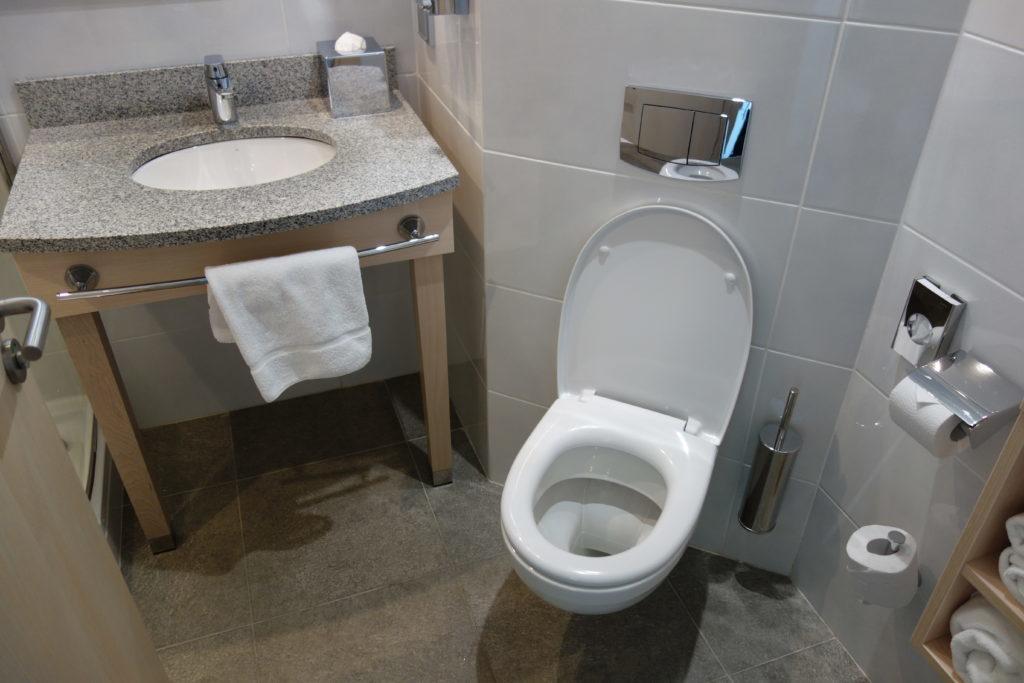 Душевая выглядела скромно, с шампунем и гелем из диспенсеров.