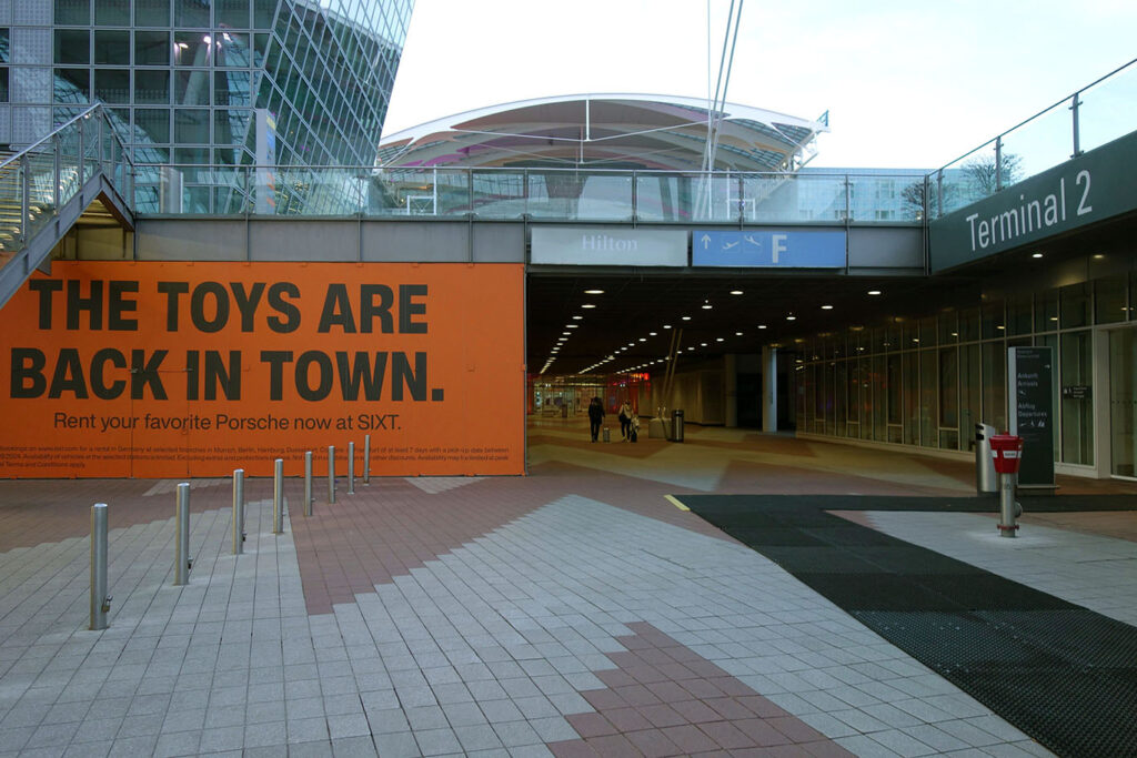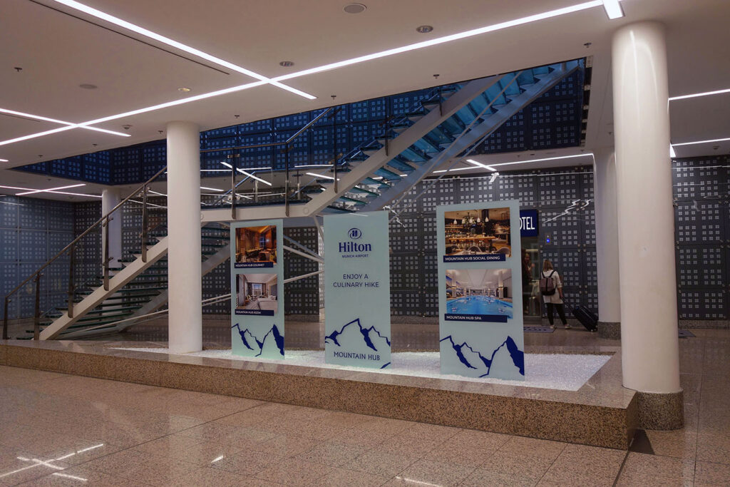 В этом отношении, Hilton Munich Airport – трушный аэропортовый отель. Выйдя из зала прилётов любого из двух терминалов, вы сразу увидите указатели к Hilton Hotel. (На фотографии – путь из терминала Т2.)