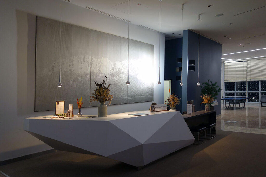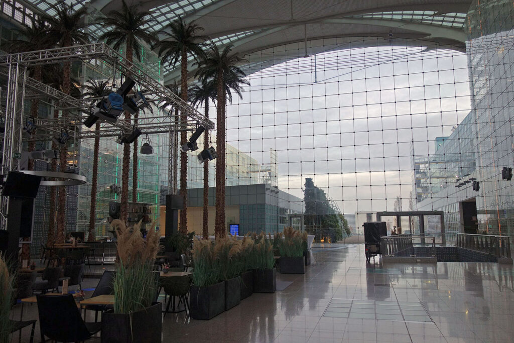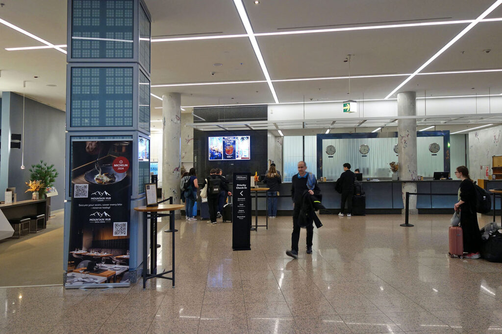 Лобби представляет собой массивный многоэтажный стеклянный атриум/зимний сад: в нём легко потеряться и не найти скромно расположенную зону регистрации.