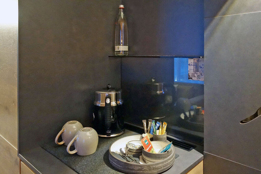 Еще одна комплиментарная бутылка воды ждала в зоне минибара. Здесь же был электрочайник, но не было кофе-машины (странно для сьюта).