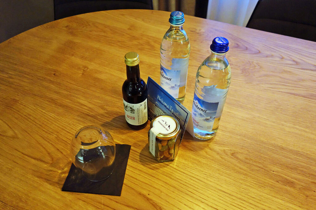 На столе меня ждал приветственный подарок: мини-пузырёк [отвратительного] пино нуара, орешки и две бутылки воды.