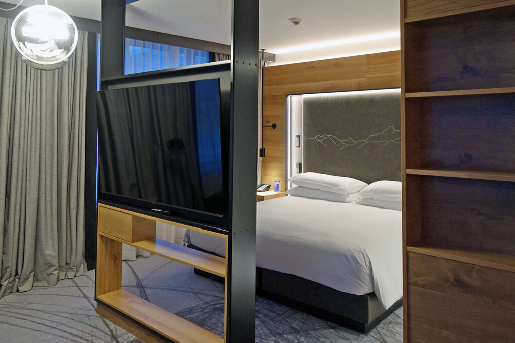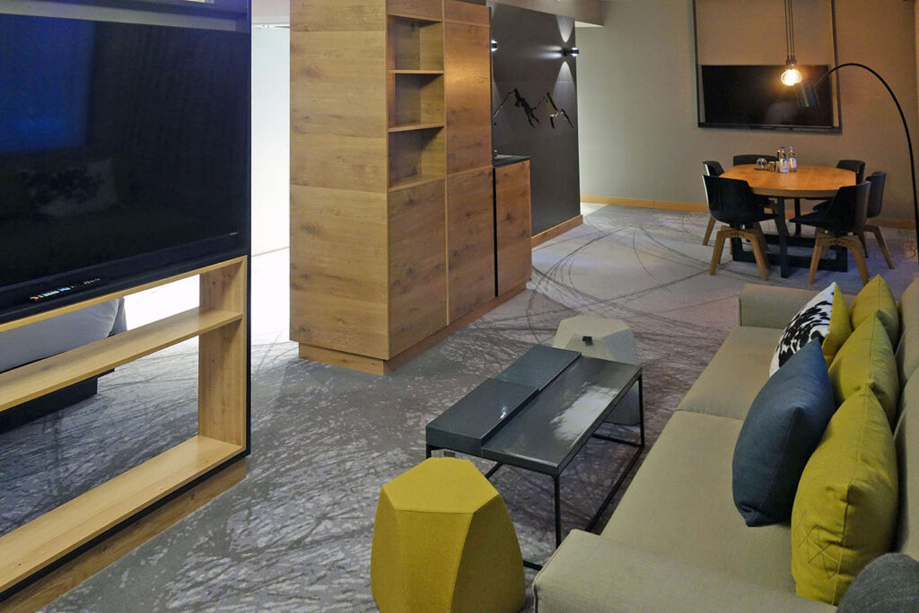 Если существует теоретическая категоризация, которая помогает управлять ожиданиями от отельных номеров, то Executive Suite принято считать высокой категорией сьютов. Но вот мой Executive Suite в Hilton Munich Airport оказался больше похож на Junior Suite: зона гостиной была отделена от спальной зоны стойкой с телевизором, но не полноценной стенкой с дверью.
