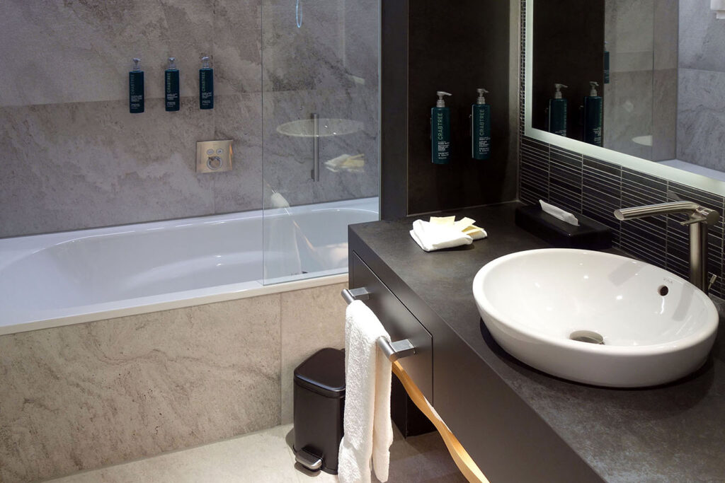Ванная комната включала лоханку, душевую кабину и одну раковину. Шампунь и гель были, как всегда в Hilton, бренда Crabtree&Evelyn.
