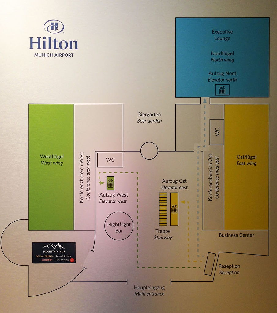 Hilton Munich Airport поделён на три жилых корпуса, каждый со своим лифтом. (Ориентации в отеле должна помочь карта.)