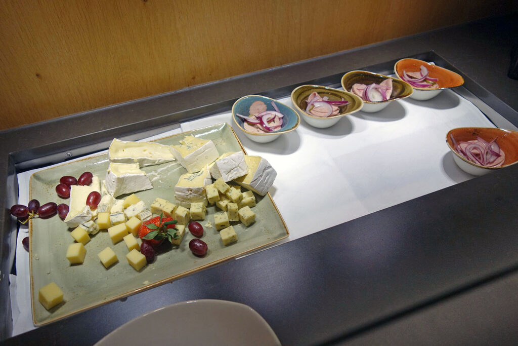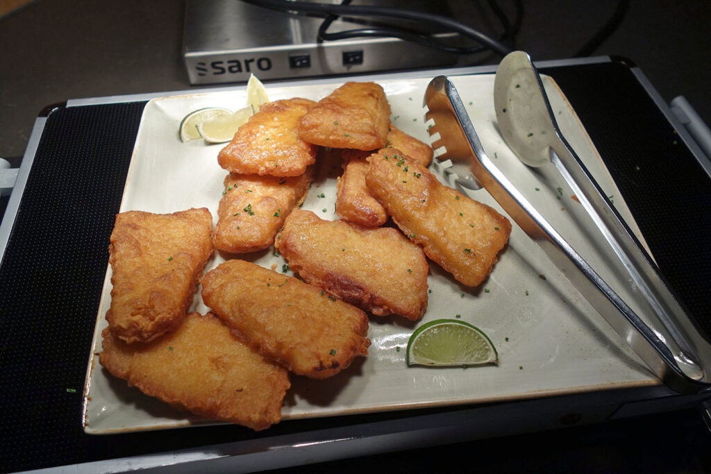 Вечерний корм, который накрывают с 18:00 до 20:30, был минимальным: одно горячее блюдо (в мой визит – рыба в панировке), колбасный салат и сырные нарезки.