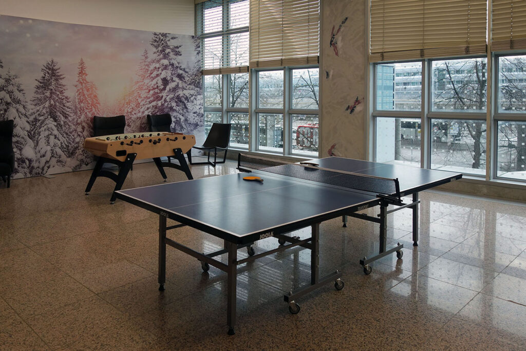 Помимо стоек регистрации, здесь расположены бизнес-центр и комната с пинг-понгом и настольным футболом.