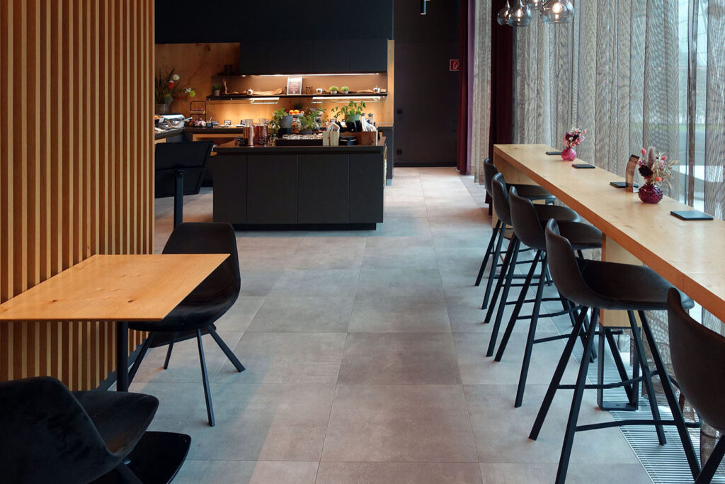 Он состоит из двух помещений с одинаковым мебельным наполнением: коммунальные столы и ряды круглых/квадратных столиков на двоих.