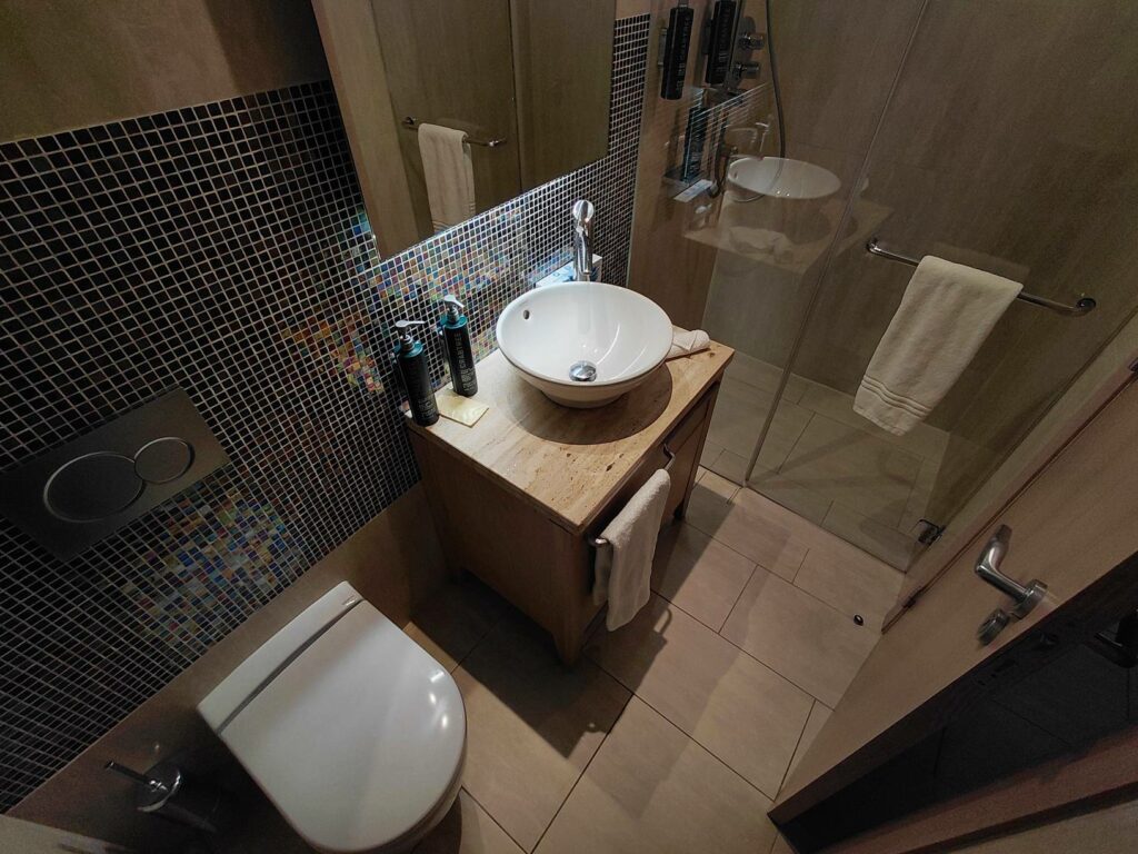 Напротив была ванная комната с душевой кабиной и унитазом.
