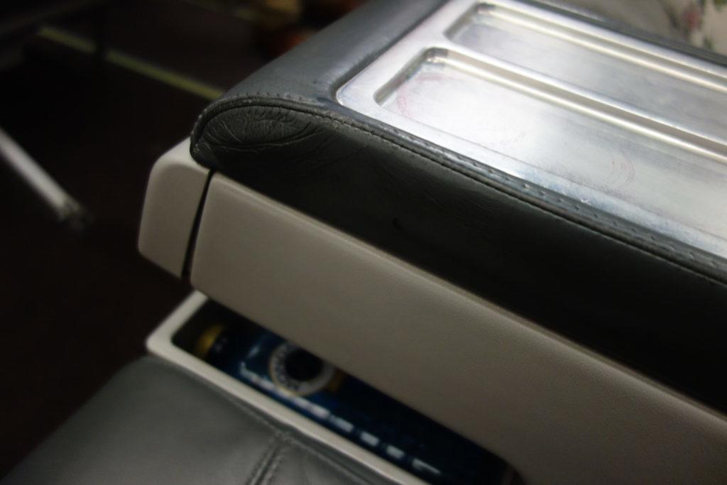Слегка углубленные металлические прямоугольники на широком подлокотнике между креслами заставляют задуматься о том, что раньше здесь были пепельницы. Антикварный продукт!