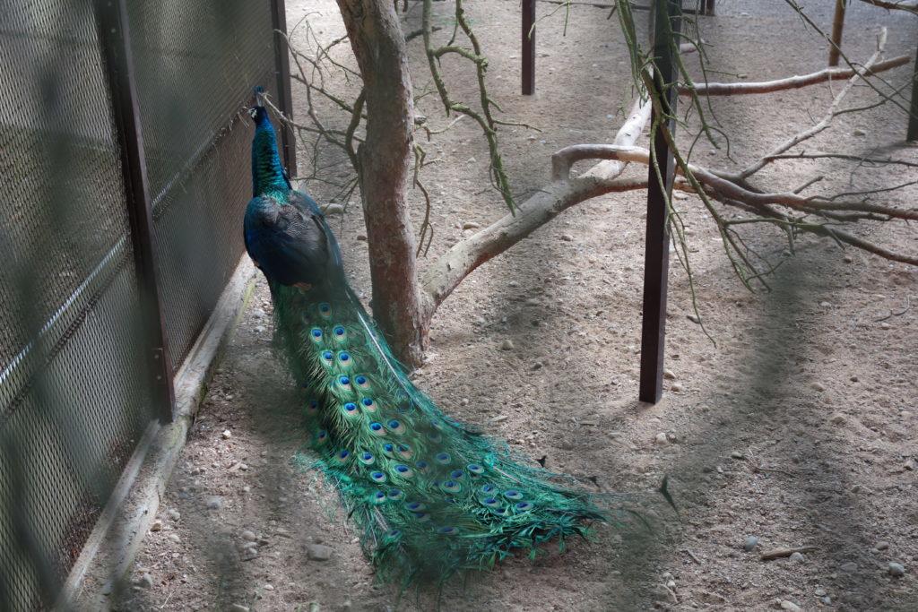 Углубившись в лес по одной из немногих дорожек, я дошел до клеток с птицами. Здесь были павлины…