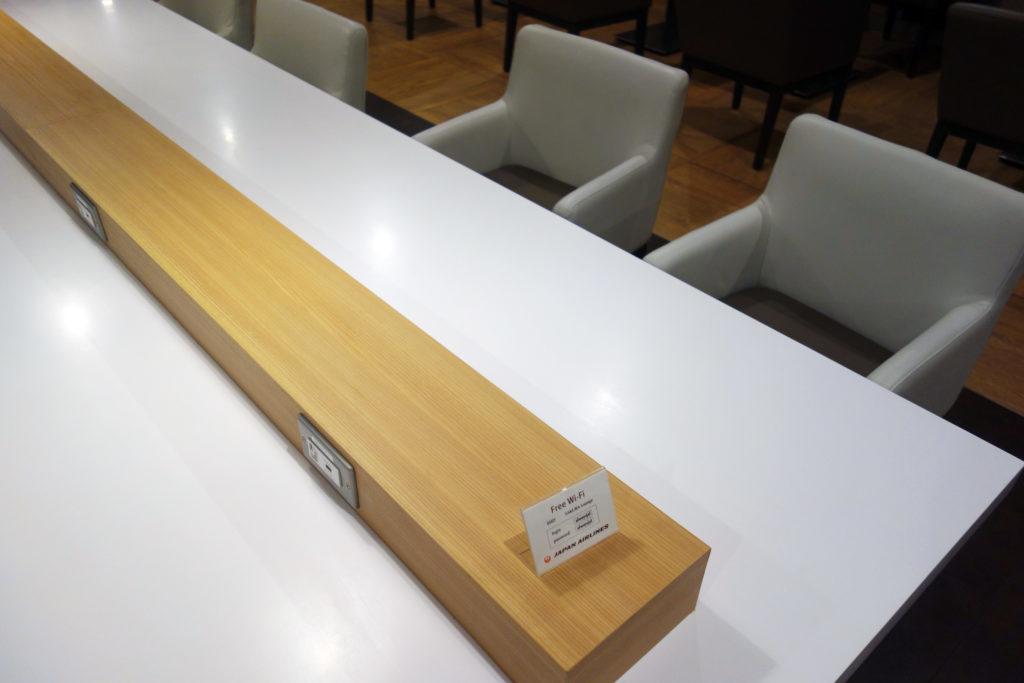 Справа от входа находится буфет, к которому мы перейдем чуть позже, а в глубине – тихое помещение с обеденными столиками и еще несколькими коммунальными столами, как у окна, так и в центре. Просто здорово, что JAL понимает, насколько важно для путешественников удобное место для работы!