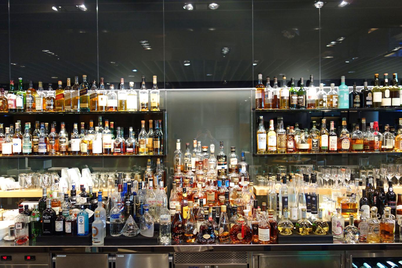 За стойкой ресепшна находится барная стойка с очень внушительным выбором алкоголя.