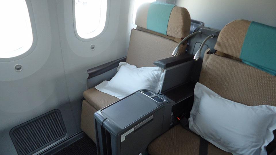 На рейсе в Бангкок снова стоял тот же самый самолет, что и на предыдущем рейсе из Парижа. Я подробно разбирал сиденье в прошлом отчете, так что не буду вдаваться в детали. На этот раз я выбрал себе место в третьем ряду первой мини-кабины, и мне посчастливилось лететь без соседа. Это очень сильно сказывается на впечатлении от полета при данной конфигурации.