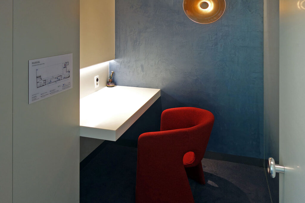 Как видите, каждый найдёт себе кусок мебели по вкусу. Помимо того, что авторы сделали выбор в пользу неординарной, яркой мебели, мне понравилось обилие электрических розеток и внимание к приватности: во многих зонах есть какие-то разделители, плюс в лаунже предусмотрено несколько полностью индивидуальных комнаток.