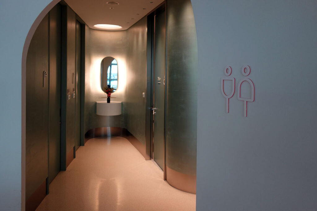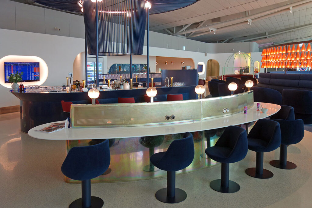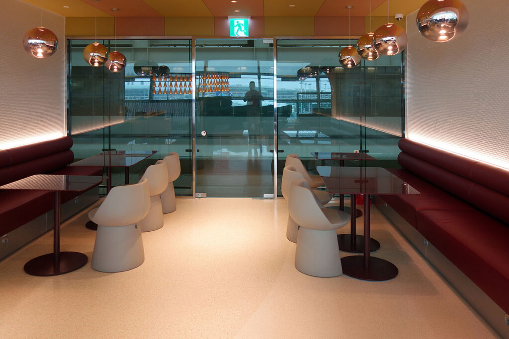 oneworld Lounge занимает площадь в 550 кв.м. и вмещает до 148 посетителей. Первое, что бросается в глаза – обилие естественного освещения за счёт выходящих на перрон окон во всю высоту, яркая мебель и неординарная геометрия.