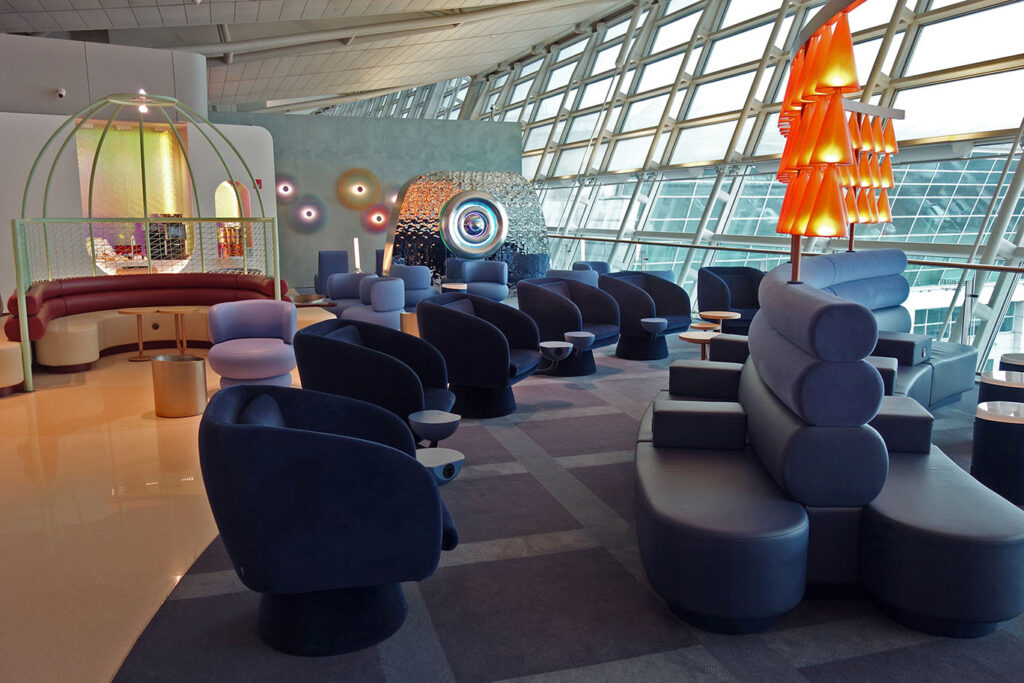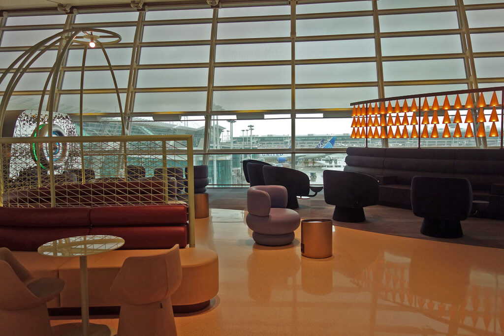 За стойками сканирования посадочных находится камера хранения, а затем проход направо открывается в основную часть лаунжа, которая представляет собой единое помещение.