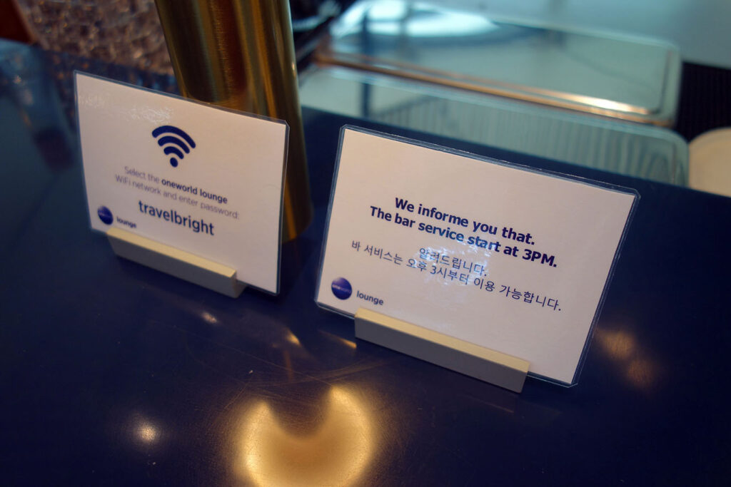 Любопытно, что меня пустили в лаунж без посадочного. Дело в том, что я пересаживался в Сеуле по разным билетам: онлайн-регистрация на рейс Cathay Pacifiс не работала, а трансферной стойки oneworld в Сеуле нету (прикиньте). Чтобы получить посадочный, надо было либо выходить из чистой зоны (то есть, дважды проходить иммигрейшн), либо дожидаться появления сотрудников Cathay на гейте. Эти самые сотрудники должны были появиться на гейте за час до вылета, но в лаунж-то хотелось попасть раньше. К сачстью, сотрудники разрешили мне войти по номеру брони.