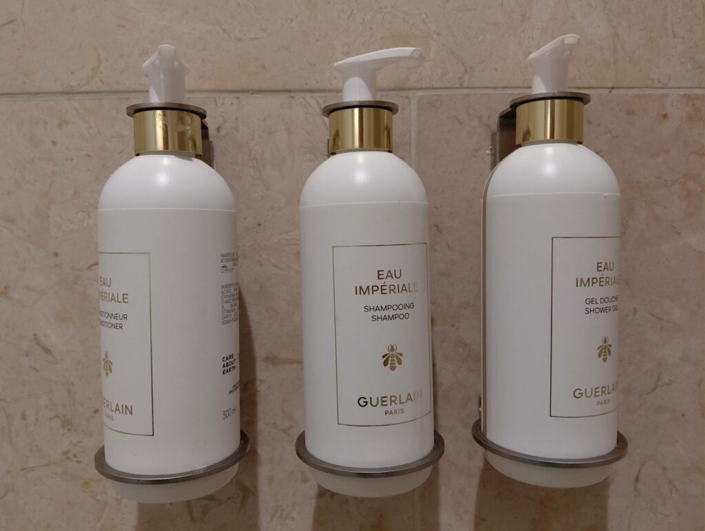 Банные жидкости были бренда Guerlain, в настенных диспенсерах.