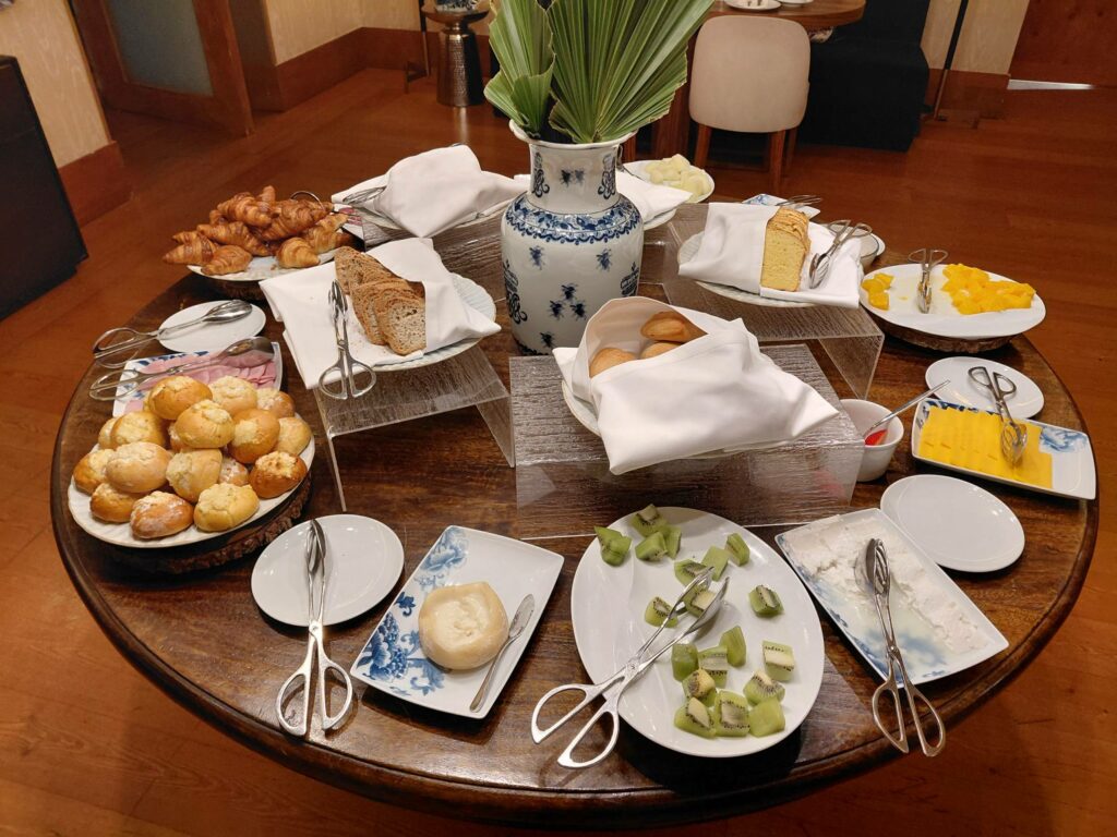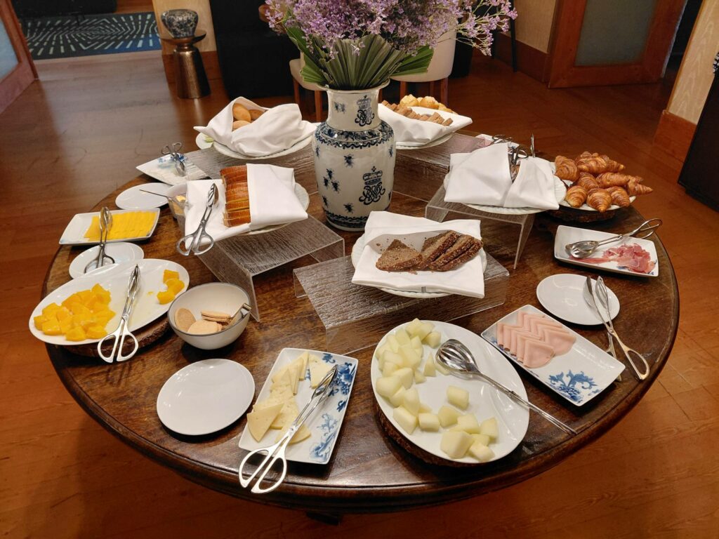 Завтрак включал буфет: прилавок с соками и игристым вином, и круглый стол с выпечкой, фруктами, сырами и колбасами. Тарелки постоянно были полупустыми.