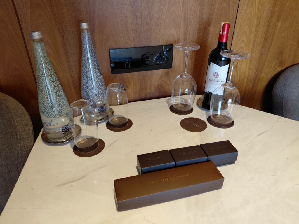 Будучи старовером. я предпочёл бы классический рабочий стол, но и имеющийся выполнил свою функцию. Приветственный подарок на столе включал бутылку вина, две бутылки воды, арабские сладости и орехи.