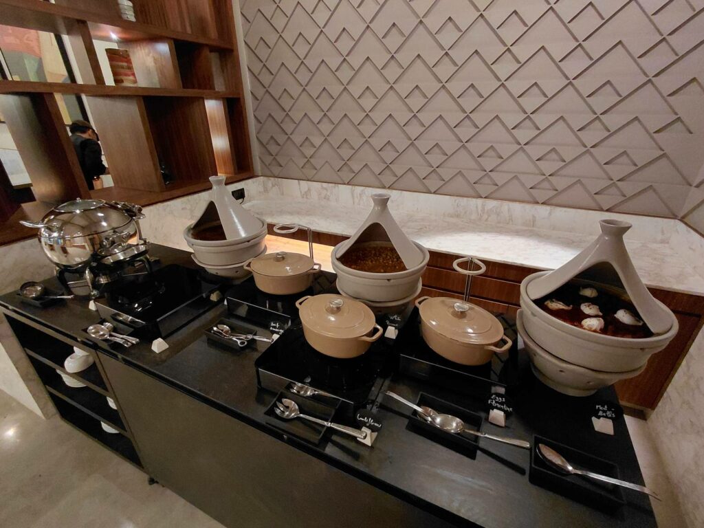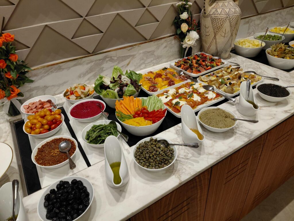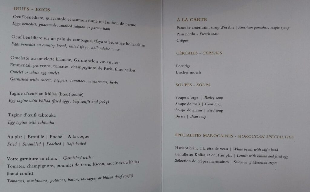 В дополнение к буфету, предлагается небольшое меню с четырьмя видами супа, марокканскими блюдами и иичками.