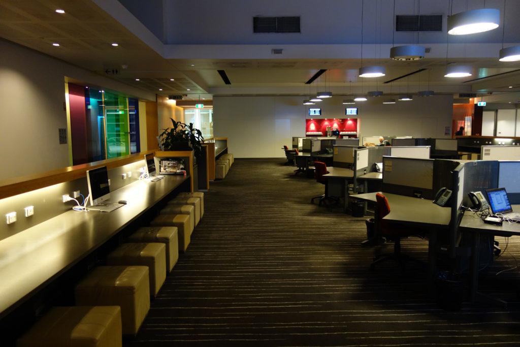 Его первая часть отдана бизнес-центру. Авиакомпании, учитесь! Десятки удобнейших, приватных мест для работы. Они довольно свободно поставлены в центре зала, а по бокам расположены длинные коммунальные столы с компьютерами.