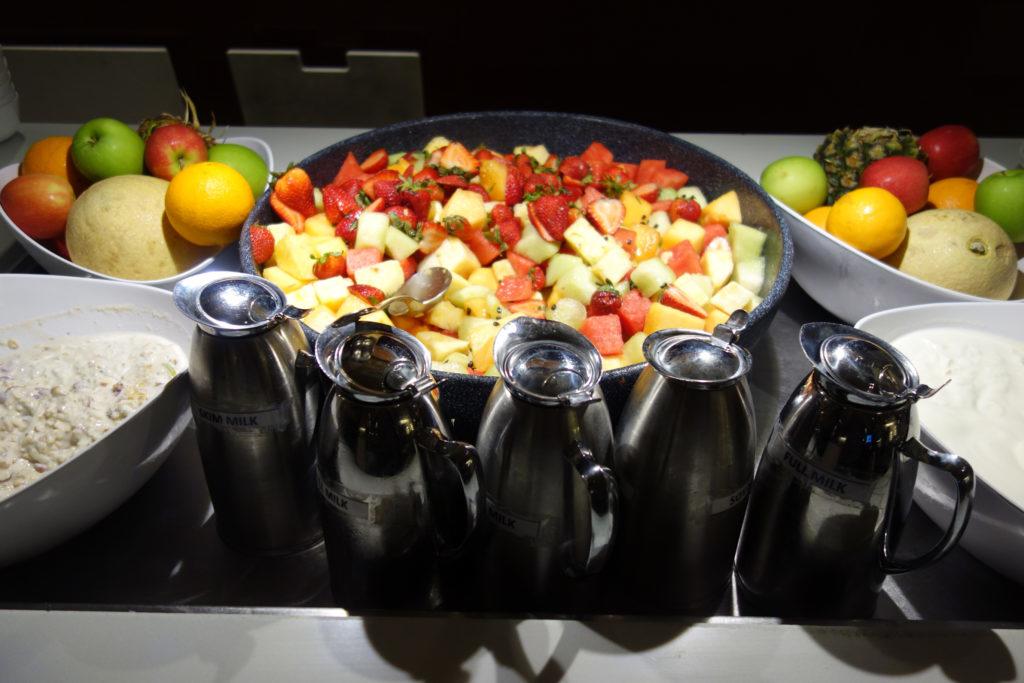 Чтобы не пришлось долго идти к основному буфету, во второй части зала есть небольшие прилавки с кофе-машинами, овсянкой и фруктами.