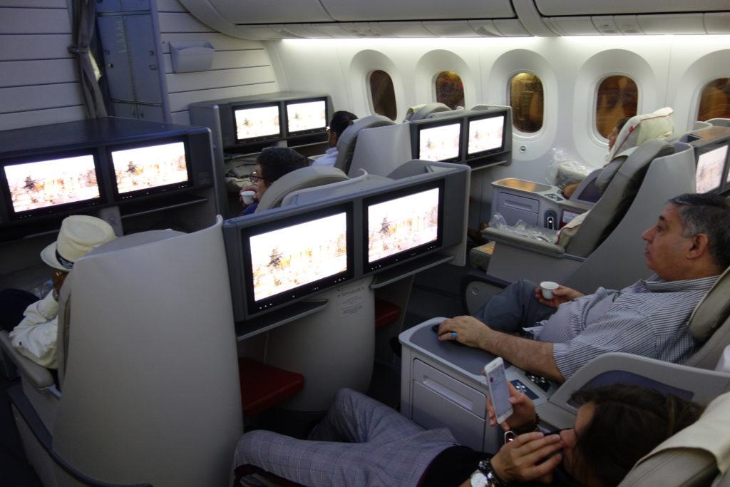 Вот еще один любопытный элемент кабины: заметьте, что каркас кресел залезает в проход. Вероятно, это точно те же самые кресла, которые устанавливаются на более широком Boeing 777 и просто физически не могут уместиться на Dreamliner’е, не “съедая” часть прохода.