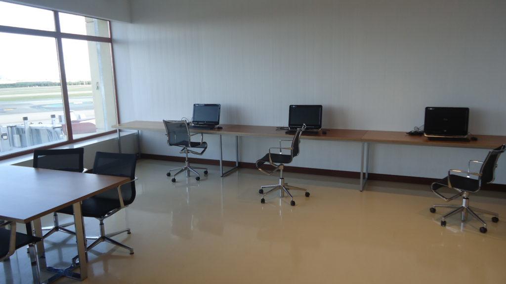 Чуть подальше находится бизнес-центр – столы у стены и круглое [нечто] посередине. С внешней стороны круглого [нечто] – еще столики для работы, а внутри – диван и круглый стол. Дизайн может показаться спорным, но могучее количество мест для работы на компьютере впечатляет.