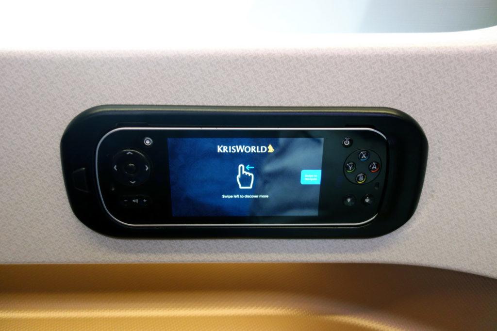 Прямо передо мной был огромный монитор. Не всегда в бизнес-классе можно дотянуться рукой до монитора, сидя в расслабленном положении; это можно было бы назвать преимуществом продукта сингапурцев, но управление системой развлечений выполняется только с пульта. Над монитором расположена продолговатая кнопка, по нажатию на которую тот слегка откидывается вниз, чтобы на него было удобнее смотреть в лежачем положении.