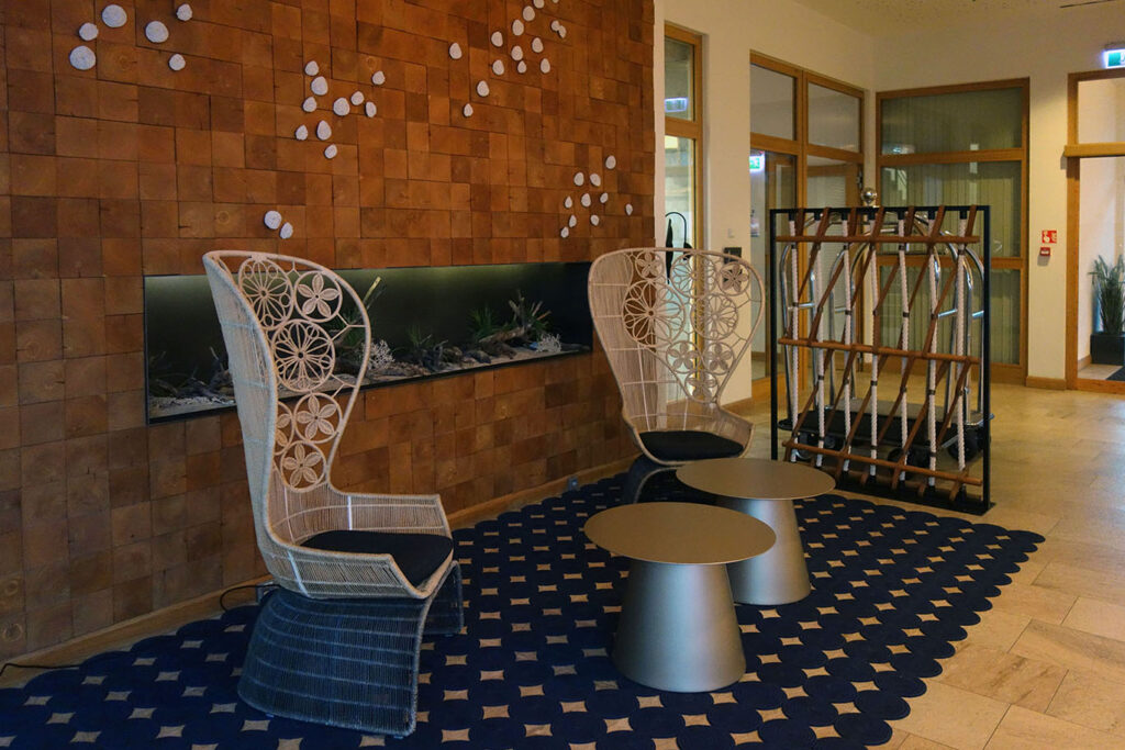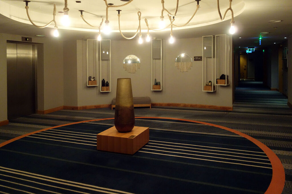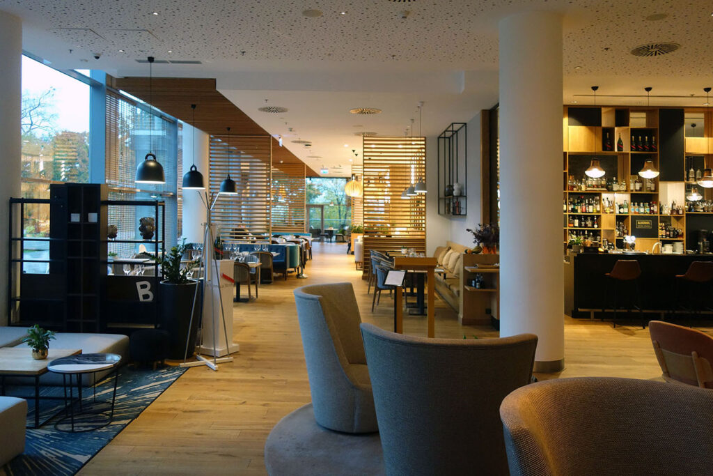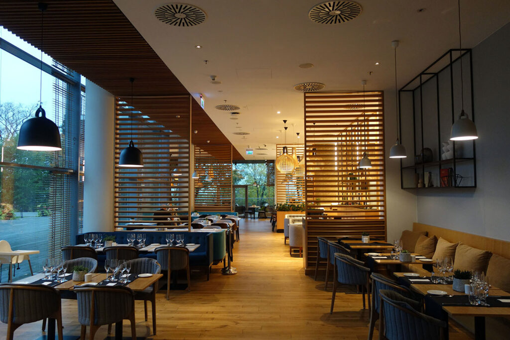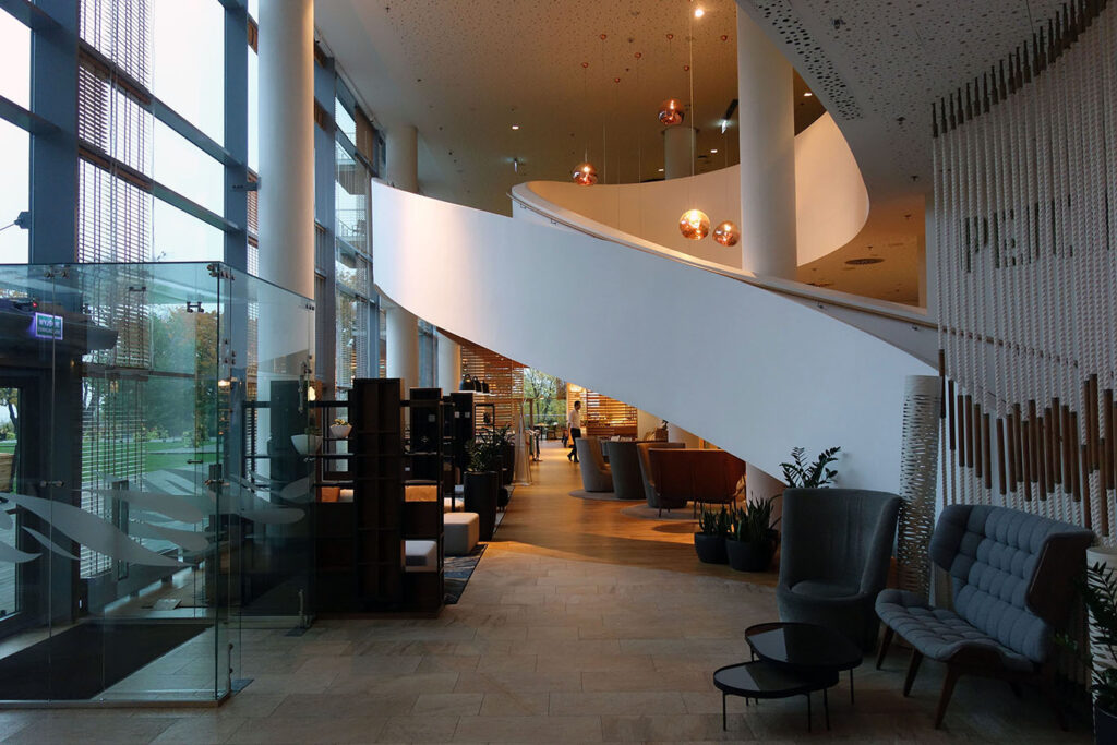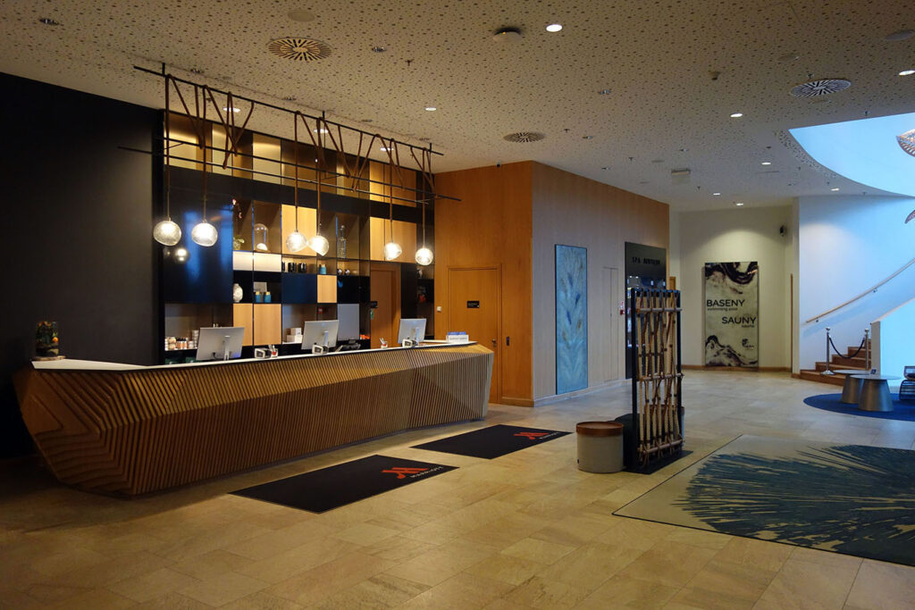Свеженько выглядящий (отель был октрыт в 2017 году, на десять лет позже Sheraton) лобби включает лишь стойки регистрации и несколько кресел. На первом этаже также расположены единственный ресторан отеля, бар и велнес-центр. Дизайн выглядит скромно, рэндомно и не вызывает ассоциаций с брендом Marriott. В плюс это или в минус, пусть каждый решает сам.